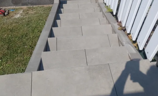 Votre carreleur à Leyment est intervenu pour une création de terrasse de 55m² avec 8 marches en dalles chez un particulier.