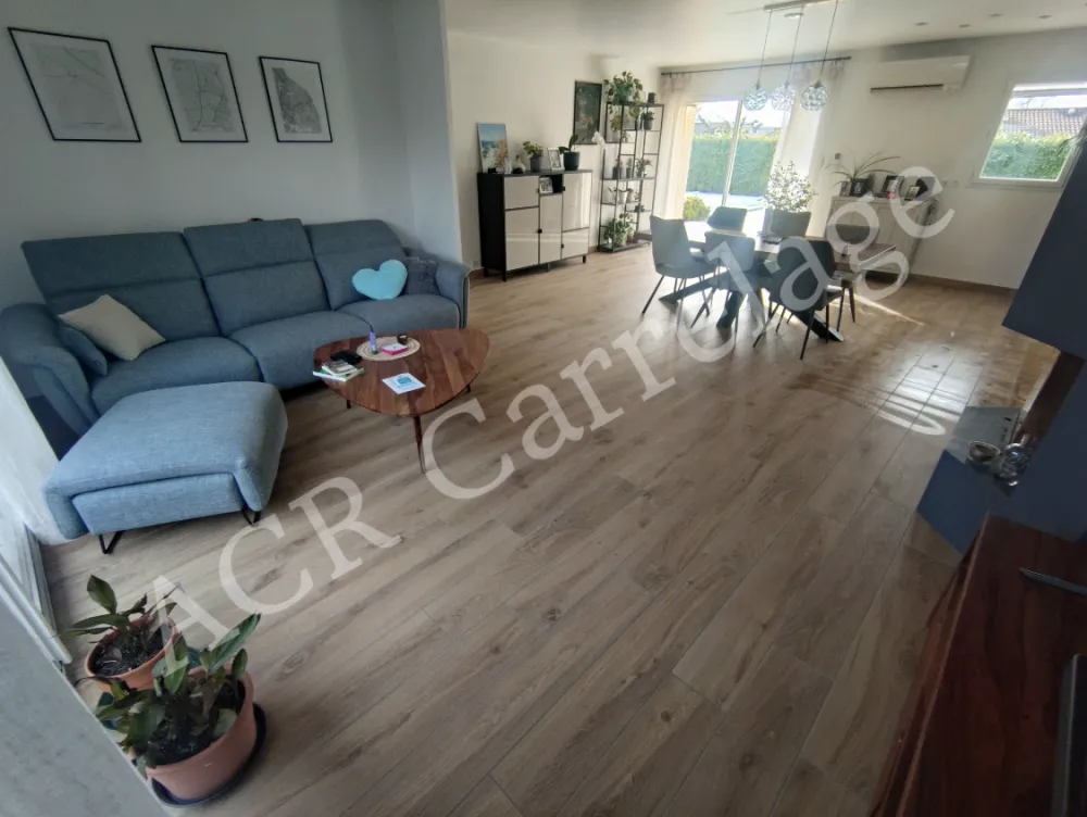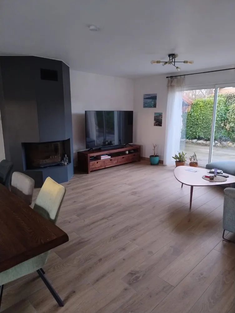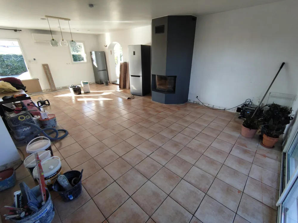 Rénovation d'un salon et d'une cuisine sur la commune d'Ambérieu en Bugey. Pose d'un carrelage imitation parquet 20/120.